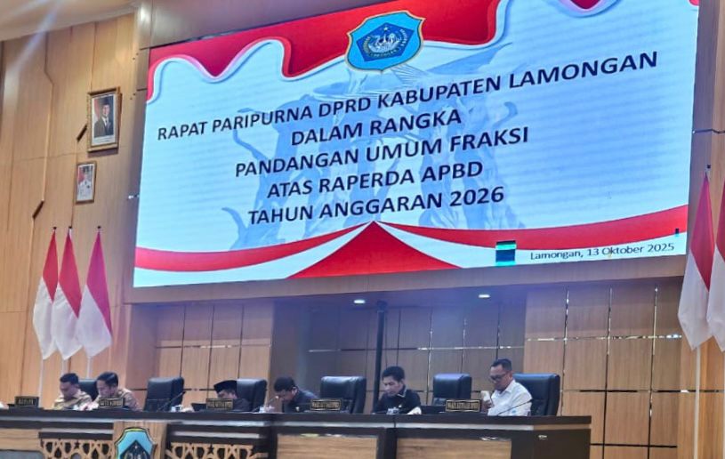 Hari ini dilaksanakan Rapat Paripurna DPRD Kabupaten Lamongan dalam rangka Penyampaian Pandangan Umum Fraksi-Fraksi terhadap Rancangan Peraturan Daerah (Raperda) tentang APBD Tahun Anggaran 2026. Rapat dipimpin langsung oleh Pimpinan DPRD dan dihadiri oleh Bupati Lamongan beserta jajaran Forkopimda, Sekretaris Daerah, serta seluruh kepala OPD di lingkungan Pemerintah Kabupaten Lamongan.