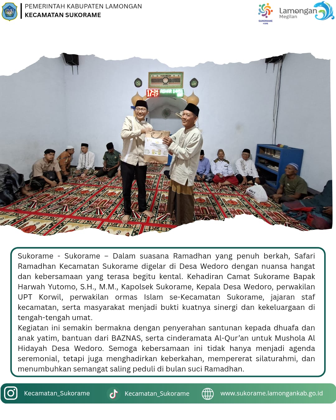 Alhamdulillah, rangkaian kegiatan Safari Ramadhan hari kedua telah terlaksana dengan penuh khidmat dan kebersamaan di Mushola Al-Hidayah Dusun Wates, yang berada di wilayah Desa Wedoro. Kegiatan ini menjadi momen yang sangat bermakna untuk mempererat tali silaturahmi antara pemerintah kecamatan, perangkat desa, tokoh agama, dan seluruh masyarakat setempat.